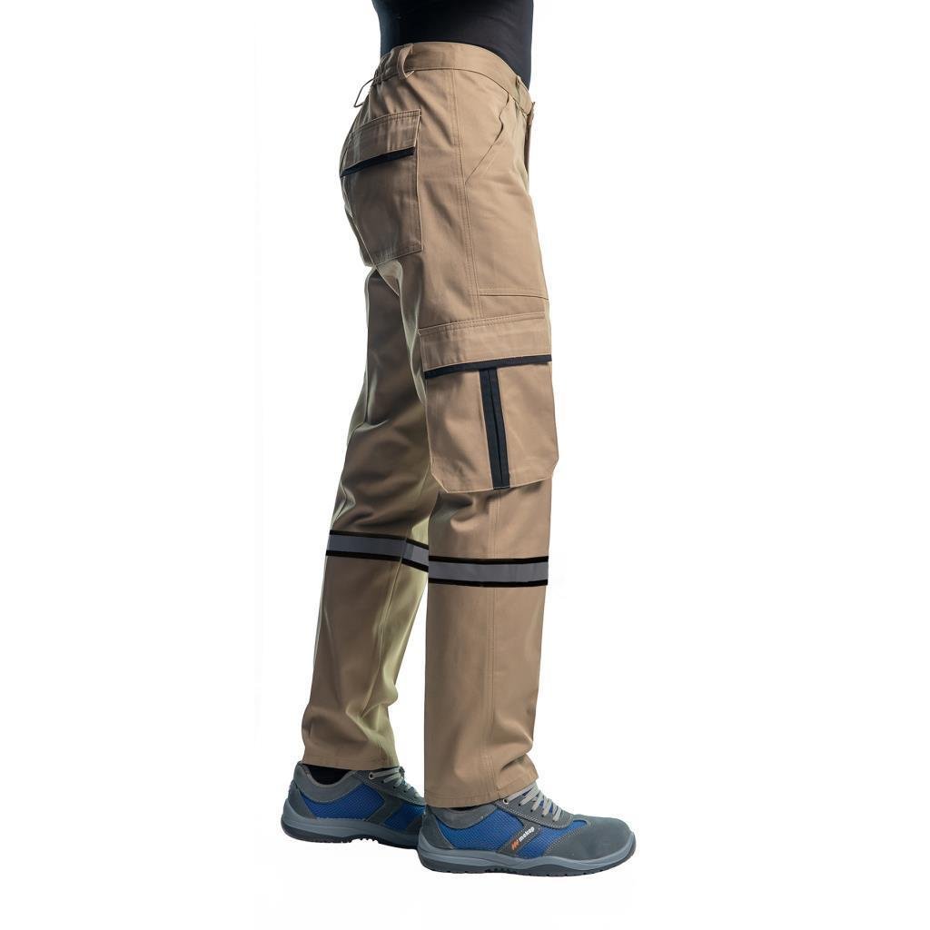 Teknik Tanım: Görünürlüğü artırmak için paçalarda siyah zemin üzerine 2cm reflektör kullanılmıştır. Ön kısımda iki dıştan takma cep, sağ dizde kapaklı körüklü komando cep, arkada kapaklı cüzdan cebi ve metre cebi olmak üzere toplam beş ceplidir. Komando cebinde her üç yanı ve ortası siyah renklidir. Cep kapakları siyah biyelidir. Bel arka kemer kısmı lastiklidir. Ergonomik kalıpla kesilmiş ürünümüz vücudunuzun doğal hareketlerine göre tasarlanmıştır. Gerekli yerler ponteriz dikişiyle sökülmelere karşı güçlendirilmiştir.
